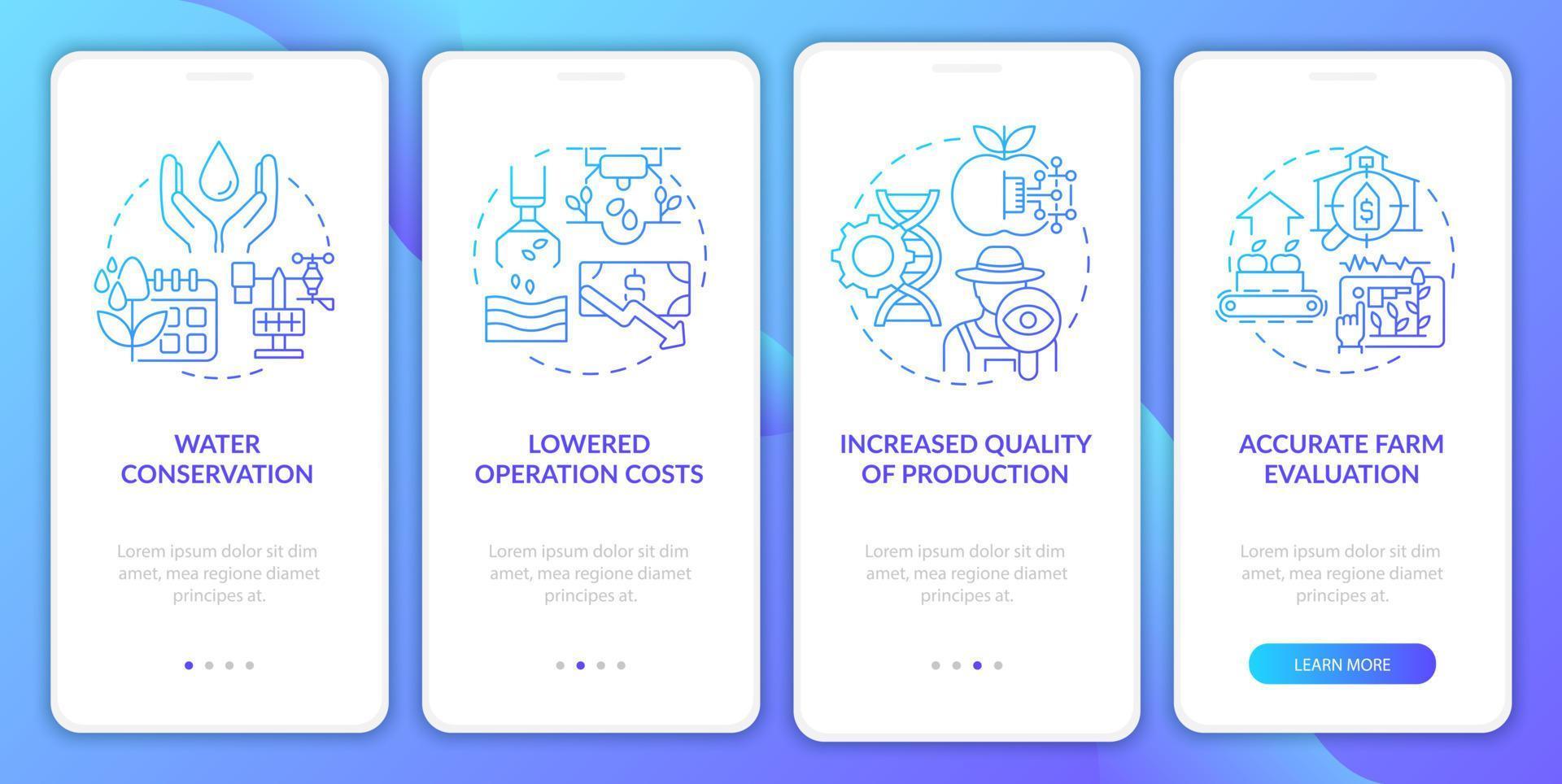 la agricultura inteligente beneficia la pantalla de la aplicación móvil de incorporación de gradiente azul. tutorial 4 pasos páginas de instrucciones gráficas con conceptos lineales. interfaz de usuario, ux, plantilla de interfaz gráfica de usuario. innumerables fuentes pro-negrita y regulares utilizadas Vector Pro