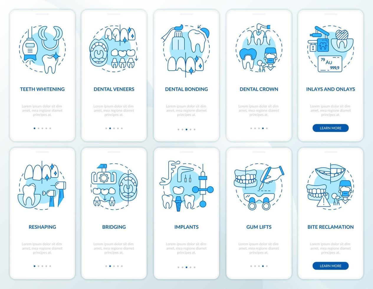 juego de pantalla de aplicación móvil de incorporación azul de medicina oral. Tutorial de restauración dental 5 pasos páginas de instrucciones gráficas con conceptos lineales. interfaz de usuario, ux, plantilla de interfaz gráfica de usuario. innumerables fuentes pro-negrita y regulares utilizadas Vector Pro