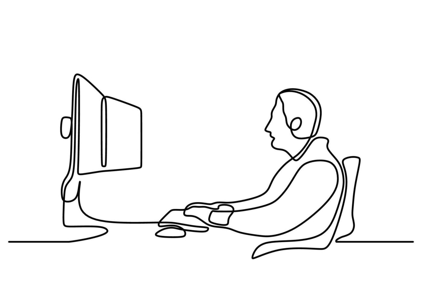 hombre utilizando computadora uno línea dibujo para negocio presentación Vector Pro