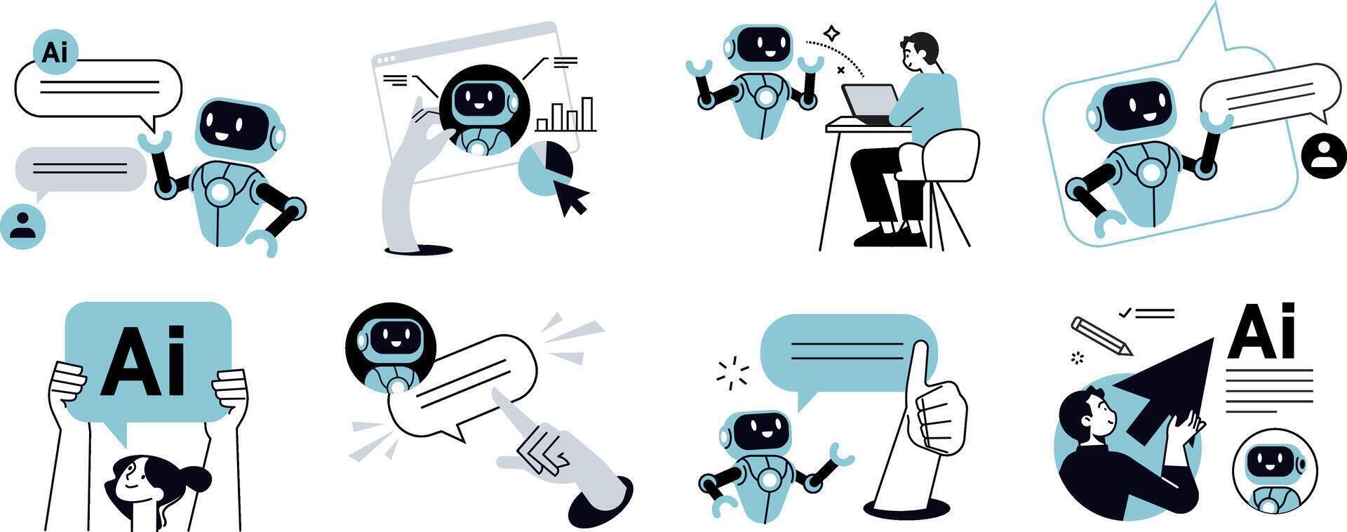 ai charla ilustraciones. conceptos de ai chatbot, ai asistente, en línea comunicación, charla ai, aplicación y servicios. Vector Pro