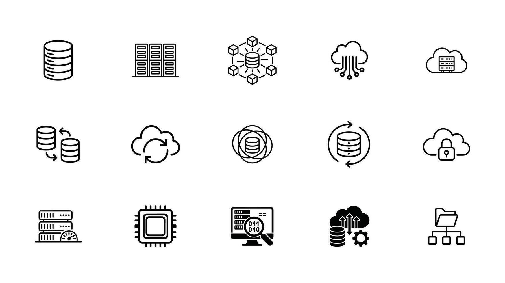 conjunto de quince negro y blanco íconos representando datos almacenamiento y nube informática base de datos servidor Vector Pro