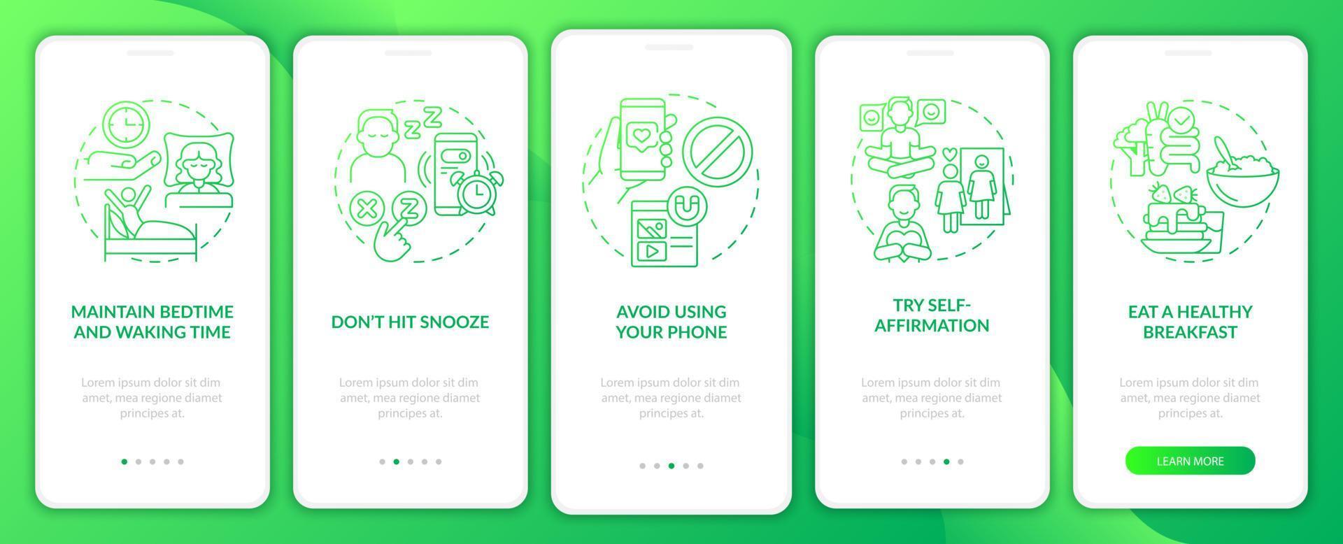 construya la pantalla de la aplicación móvil de incorporación de degradado verde de rutina matutina. tutorial de ideas 5 pasos páginas de instrucciones gráficas con conceptos lineales. interfaz de usuario, ux, plantilla de interfaz gráfica de usuario. innumerables fuentes pro-negrita y regulares utilizadas Vector Pro
