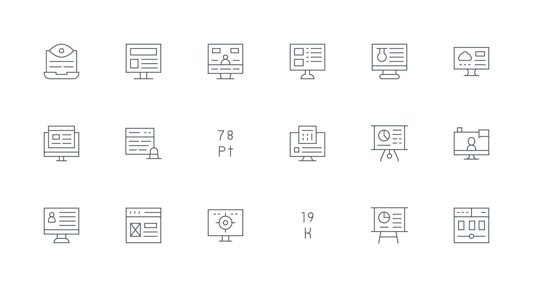 mínimo línea íconos desde datos monitor conjunto con 18 vectores completar icono conjunto para móvil aplicaciones