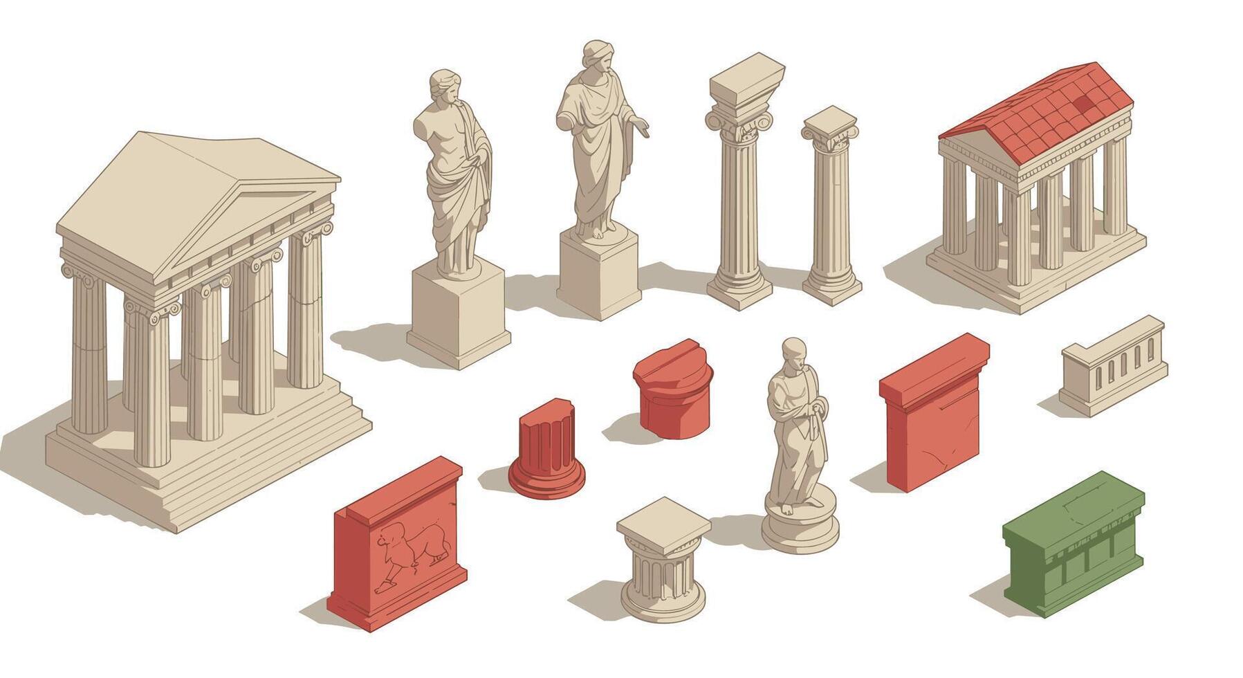 isométrica antiguo arquitectura elementos columnas, estatuas, y templos Vector Pro