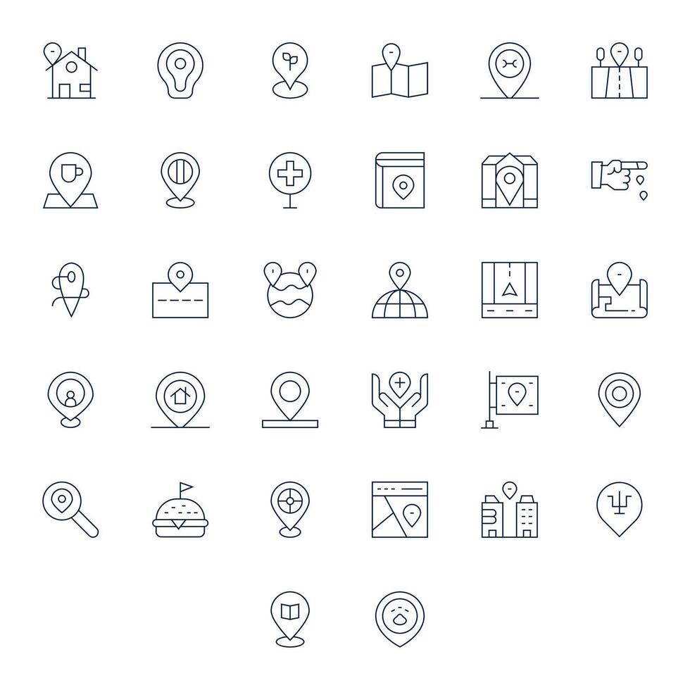 determinar con precisión ubicación completar paquete con 32 alto resolución Delgado línea píxel optimizado íconos vector