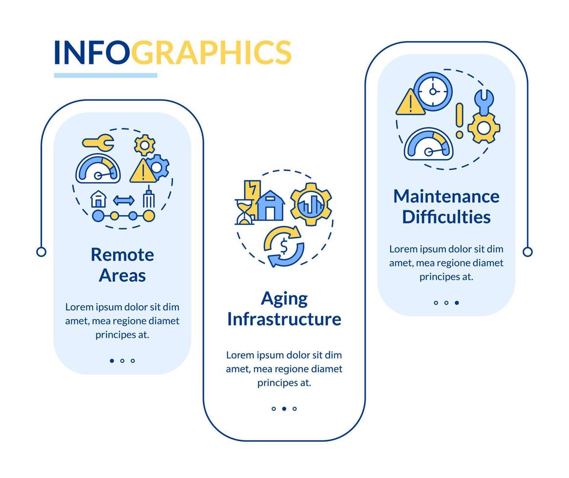 plantilla de infografía de rectángulo de obstáculos de electrificación rural. visualización de datos con 3 pasos. gráfico de información de la línea de tiempo del proceso. diseño de flujo de trabajo con iconos de línea. lato-negrita, fuentes regulares utilizadas Vector Pro