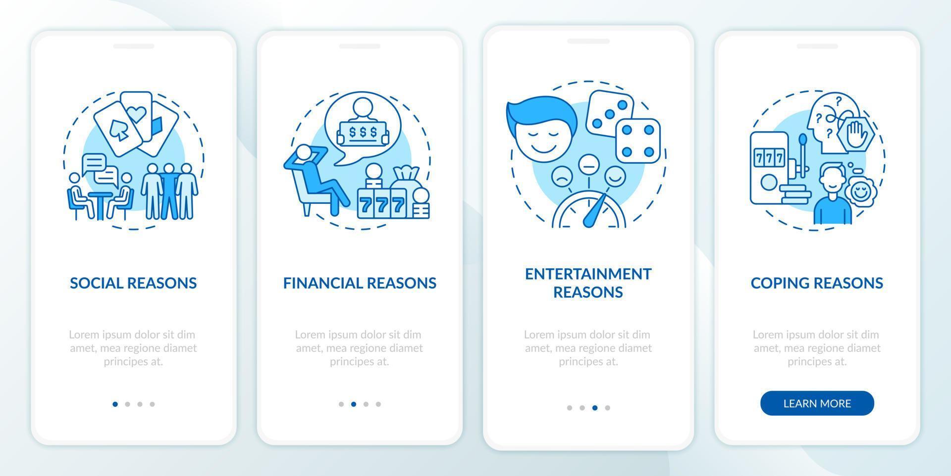 razones para apostar la pantalla azul de la aplicación móvil de incorporación. tutorial compulsivo 4 pasos páginas de instrucciones gráficas con conceptos lineales. interfaz de usuario, ux, plantilla de interfaz gráfica de usuario. innumerables fuentes pro-negrita y regulares utilizadas Vector Pro