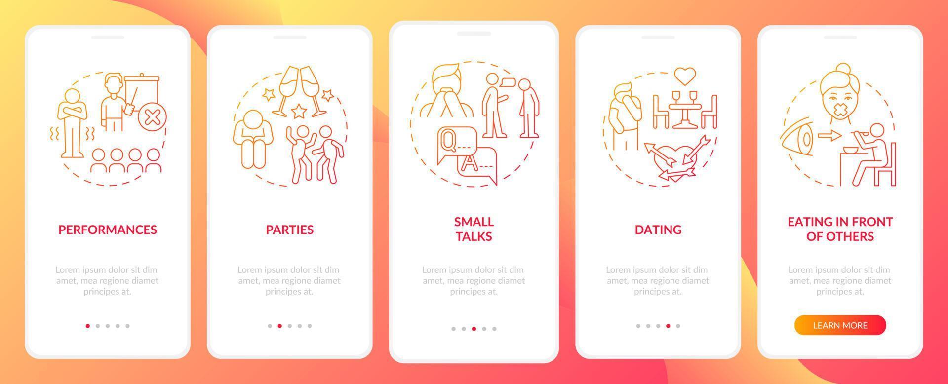 la ansiedad común desencadena la pantalla de la aplicación móvil de incorporación de gradiente rojo. tutorial de salud 5 pasos páginas de instrucciones gráficas con conceptos lineales. interfaz de usuario, ux, plantilla de interfaz gráfica de usuario. innumerables fuentes pro-negrita y regulares utilizadas Vector Pro