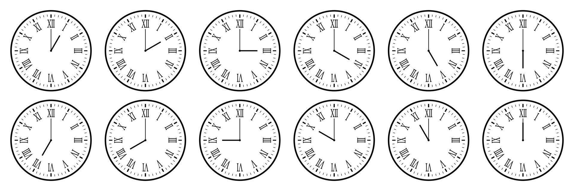 horizontal conjunto de término análogo reloj icono con romano número notificando cada hora aislado en blanco, ilustración. Vector Pro