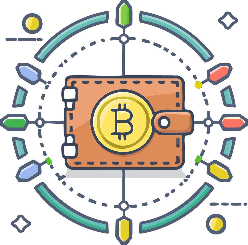 digital billetera con bitcoin divisa, conectado a blockchain red en un estilizado composición, promoviendo seguro virtual actas Vector Pro