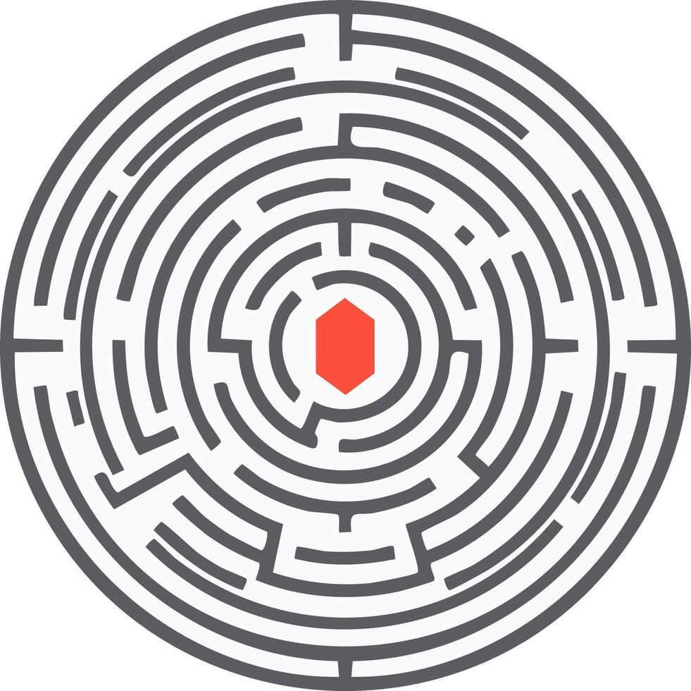 circular laberinto con central rojo objetivo, camino hallazgo rompecabezas, y problema resolviendo concepto Vector Pro