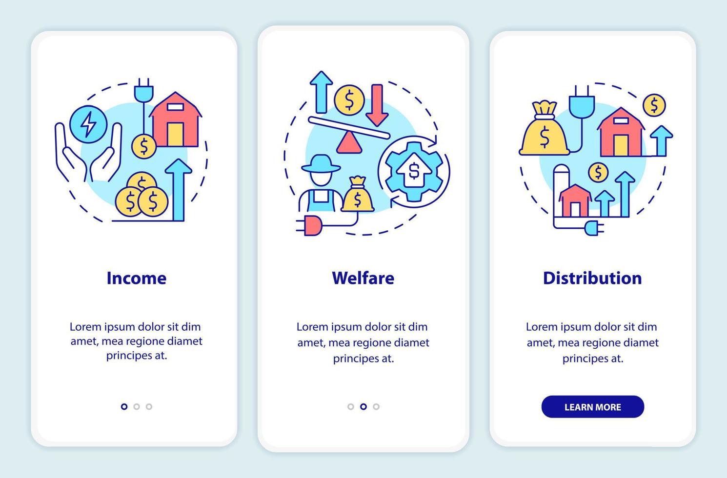 impacto de la electrificación rural incorporando la pantalla de la aplicación móvil. tutorial 3 pasos páginas de instrucciones gráficas con conceptos lineales. interfaz de usuario, ux, plantilla de interfaz gráfica de usuario. innumerables fuentes pro-negrita y regulares utilizadas Vector Pro