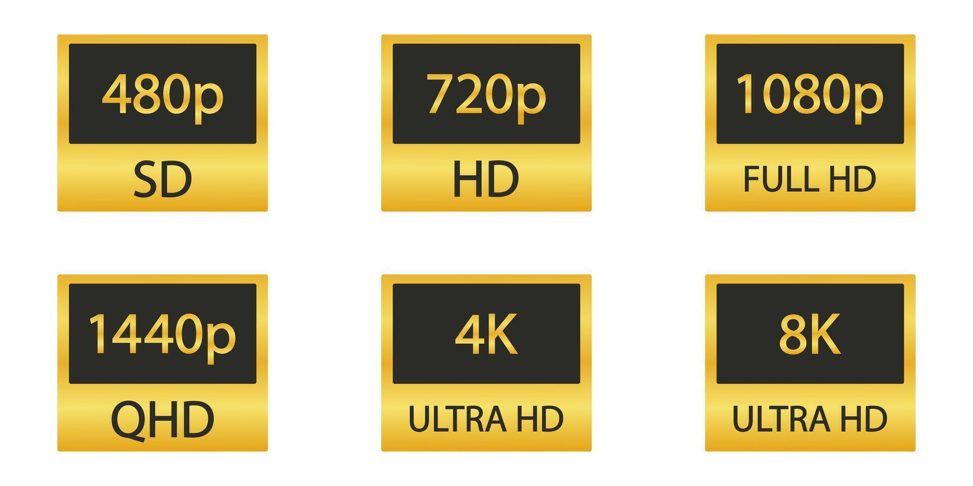 resolución íconos colocar. monitor calidad y pantalla resolución oro símbolo recopilación. multimedia y tecnología usar. aislado ilustración Vector Pro
