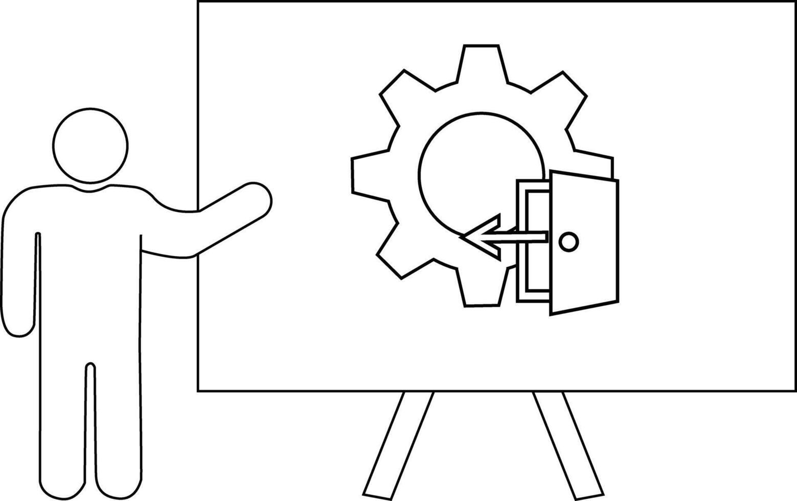 presentación persona gestos a un caballete mostrando un engranaje y un puerta con un flecha señalando interior Vector Pro