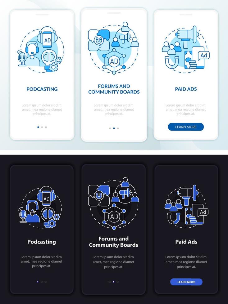 modo de marketing digital modo día y noche incorporando la pantalla de la aplicación móvil. Guía de anuncios Páginas de instrucciones gráficas de 3 pasos con conceptos lineales. interfaz de usuario, ux, plantilla de interfaz gráfica de usuario. Vector Pro
