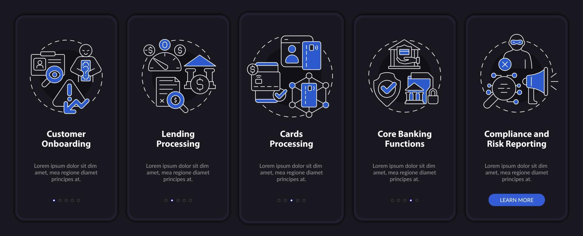 pantalla de aplicación móvil de incorporación de modo nocturno de banca automatizada. tutorial 5 pasos páginas de instrucciones gráficas con conceptos lineales. interfaz de usuario, ux, plantilla de interfaz gráfica de usuario. Vector Pro