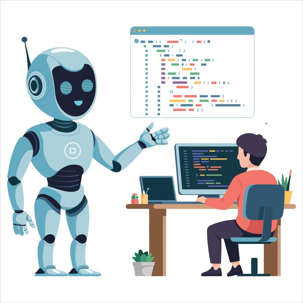 robot ayudando programador con código en computadora codificación Vector Gratis