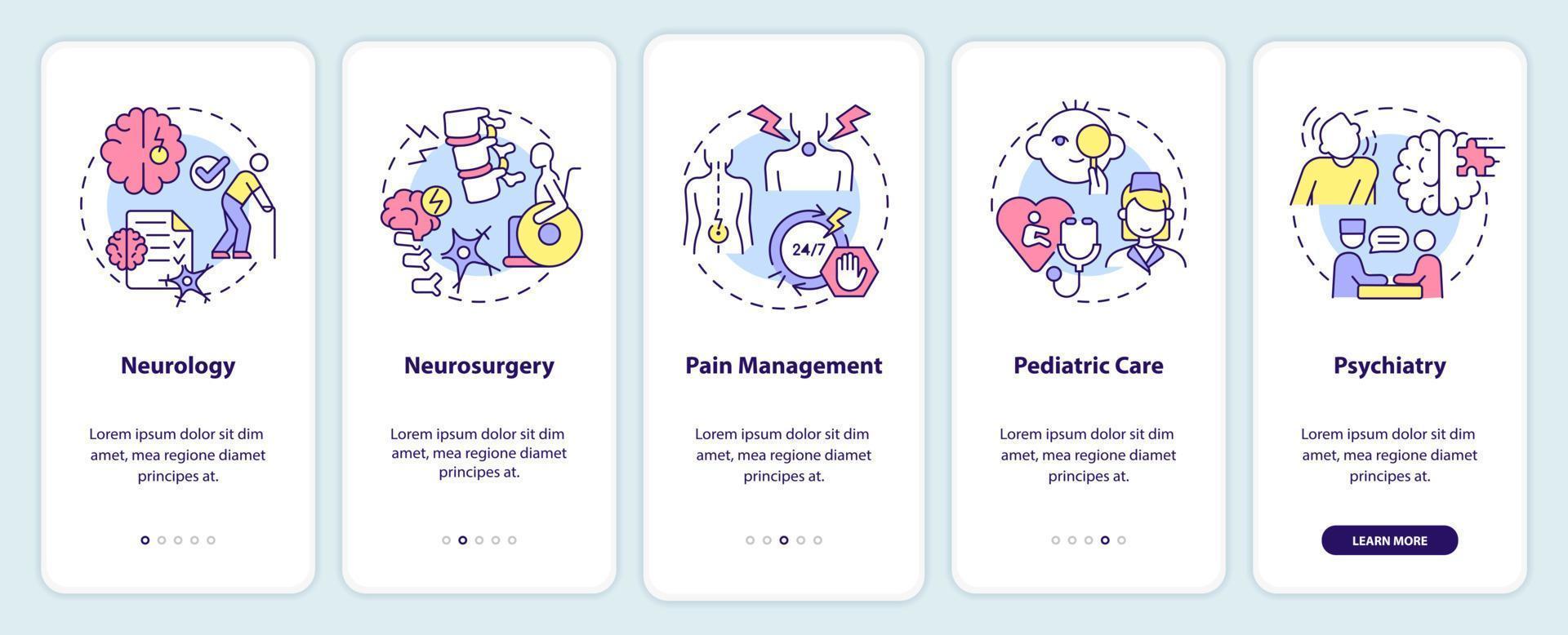 pantalla de aplicación móvil de incorporación de servicios de clínica médica. tutorial del hospital 5 pasos páginas de instrucciones gráficas con conceptos lineales. interfaz de usuario, ux, plantilla de interfaz gráfica de usuario. Vector Pro