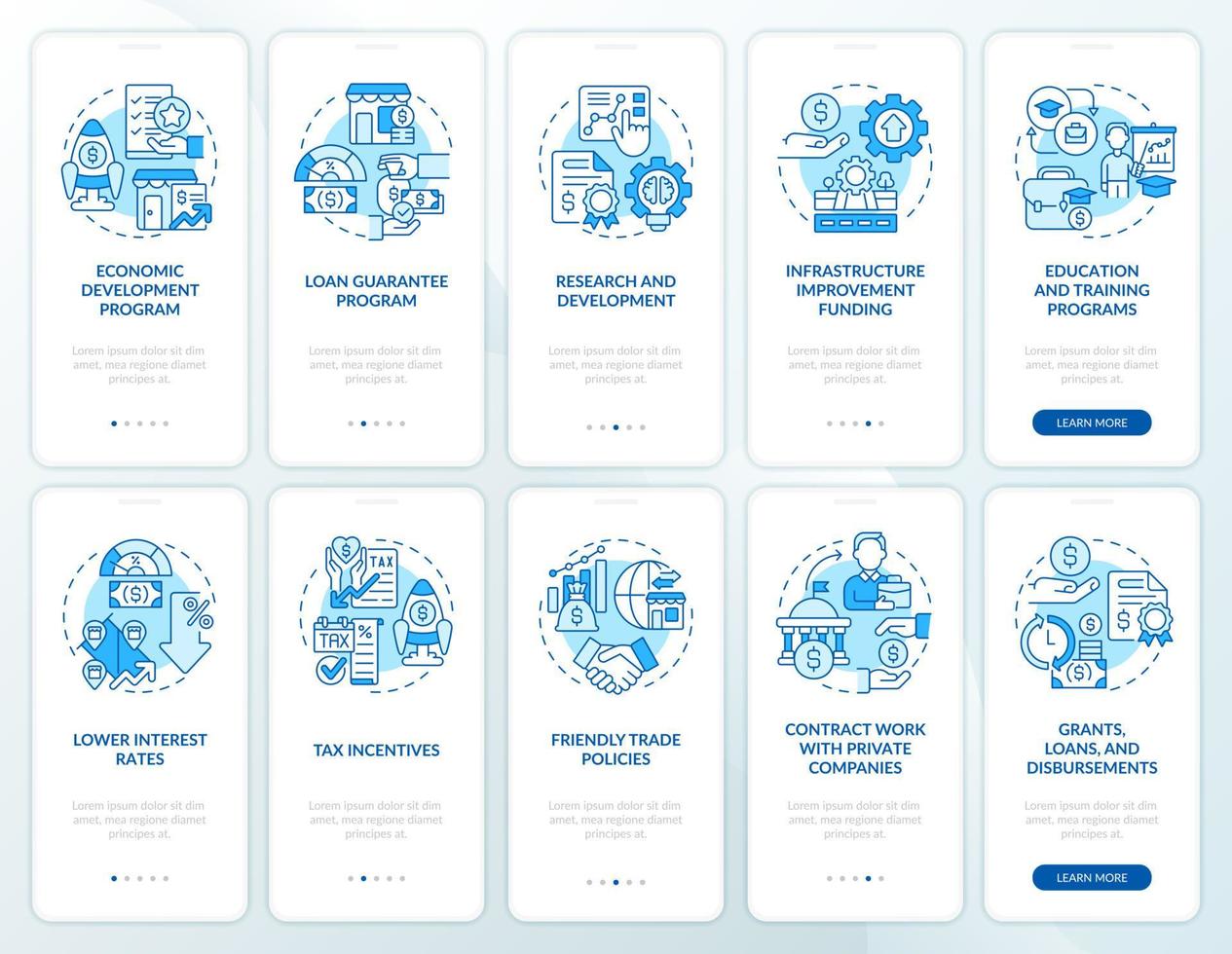 conjunto de pantalla de aplicación móvil de incorporación azul de incentivos para pequeñas empresas. Soporte tutorial 5 pasos páginas de instrucciones gráficas con conceptos lineales. interfaz de usuario, ux, plantilla de interfaz gráfica de usuario. Vector Pro
