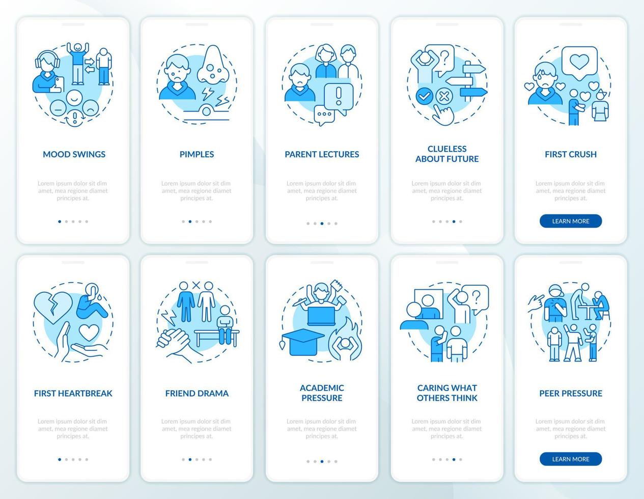 desafíos de ser un conjunto de pantalla de aplicación móvil de incorporación azul adolescente. tutorial 5 pasos instrucciones gráficas editables con conceptos lineales. interfaz de usuario, ux, plantilla de interfaz gráfica de usuario. Vector Pro