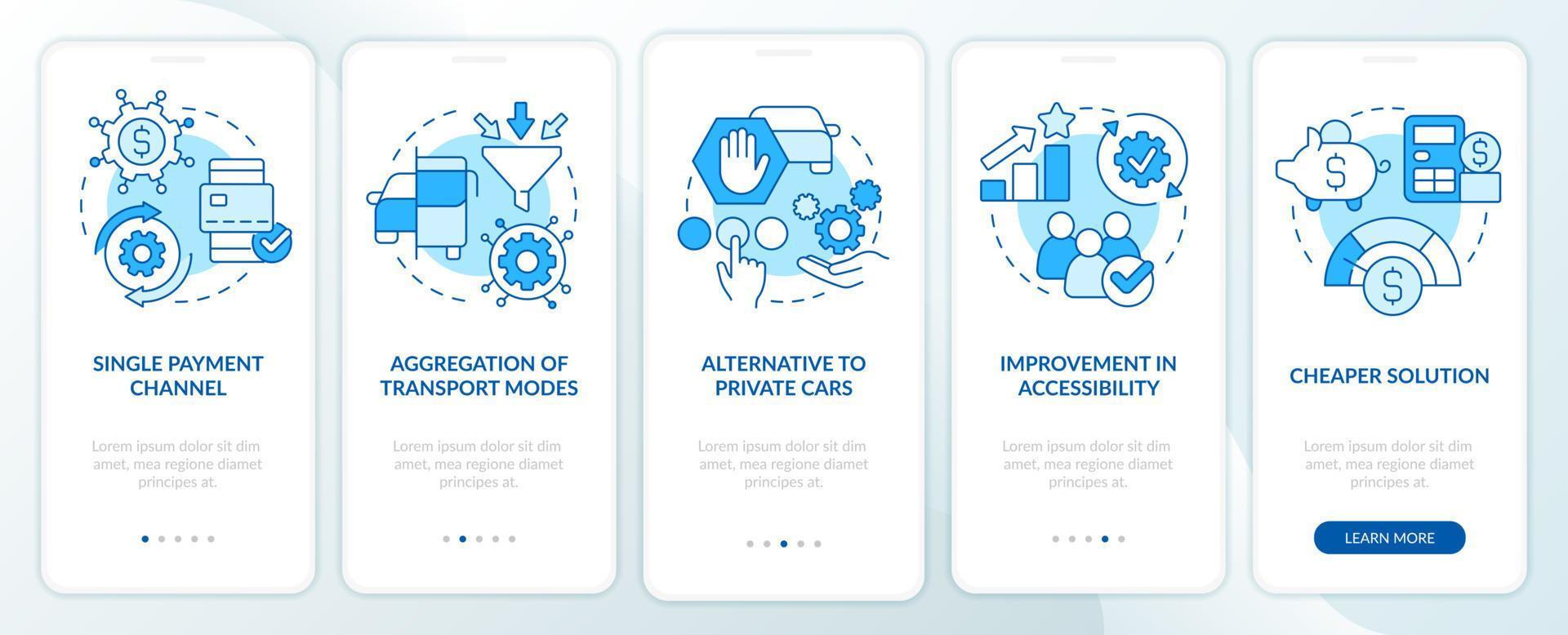 movilidad como valor de servicio pantalla de aplicación móvil de incorporación azul. cuenta con instrucciones gráficas editables de 5 pasos con conceptos lineales. interfaz de usuario, ux, plantilla de interfaz gráfica de usuario. Vector Pro
