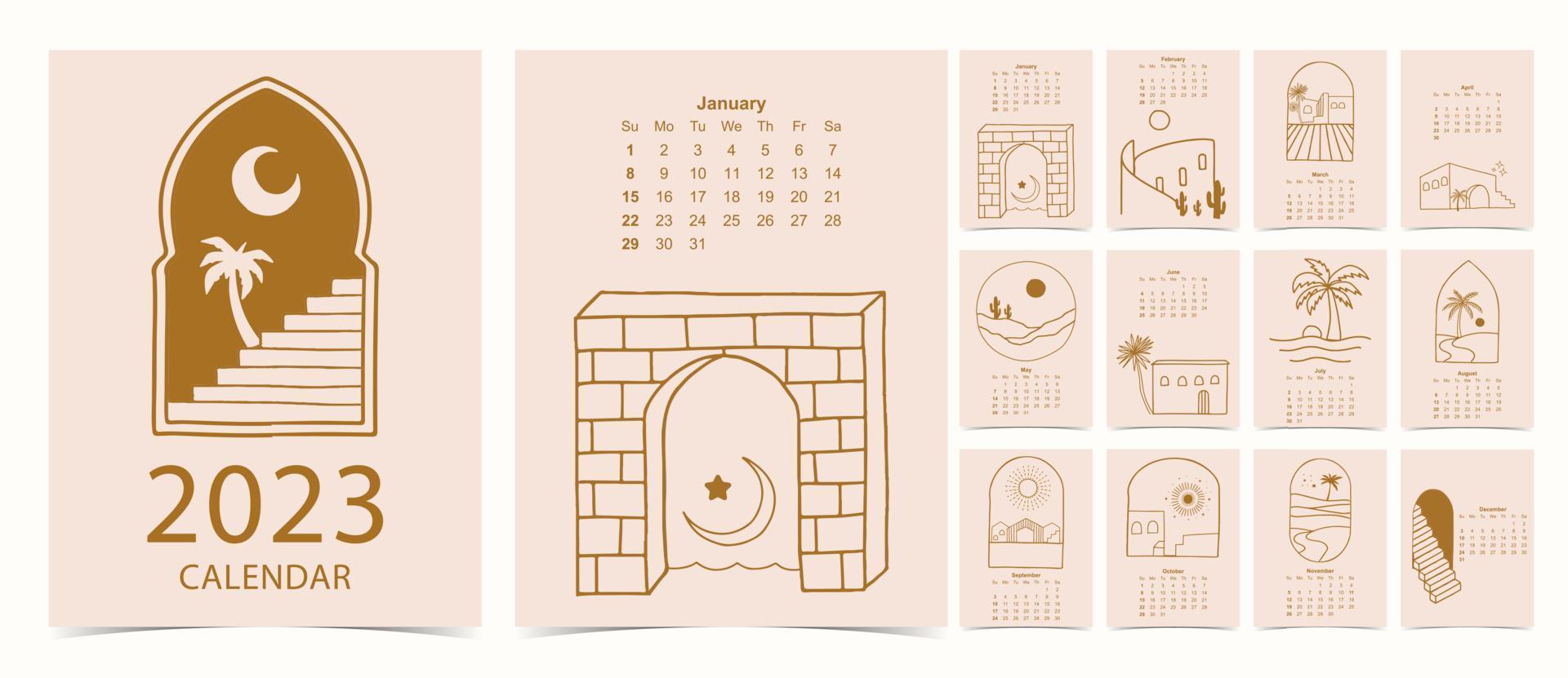 La semana del calendario de mesa 2023 comienza el domingo con arco y sol que se usan para tamaño a4 a5 digital e imprimible vertical Vector Pro