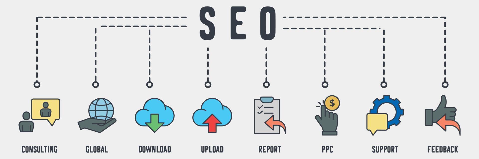 icono web de banner de optimización seo. consultoría en línea, solución global, descarga, carga, informe, pago por clic, soporte técnico, concepto de ilustración vectorial de retroalimentación. Vector Pro