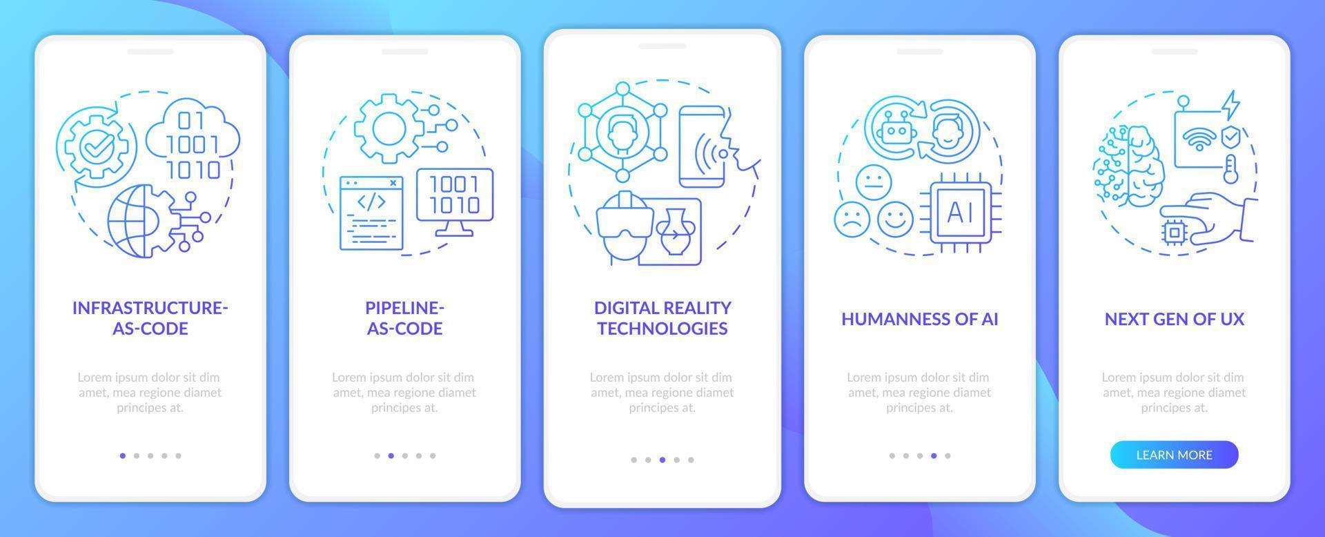 pantalla de la aplicación móvil de incorporación de degradado azul de tendencias macro tecnológicas. tutorial digital 5 pasos páginas de instrucciones gráficas con conceptos lineales. interfaz de usuario, ux, plantilla de interfaz gráfica de usuario. Vector Pro