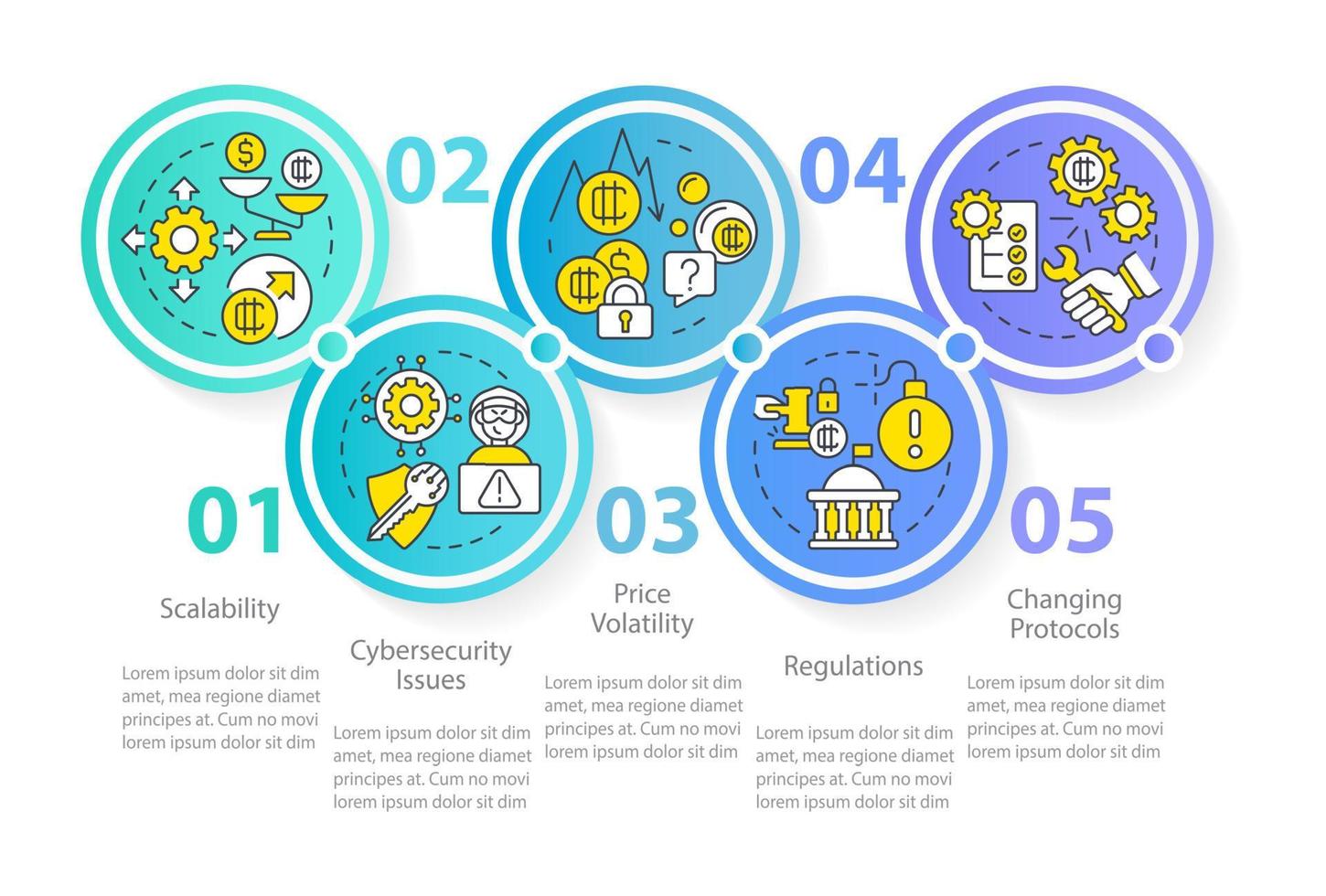 plantilla de infografía de círculo de desventajas de criptomonedas. cuestiones de ciberseguridad. visualización de datos con 5 pasos. gráfico de información de la línea de tiempo del proceso. diseño de flujo de trabajo con iconos de línea Vector Pro