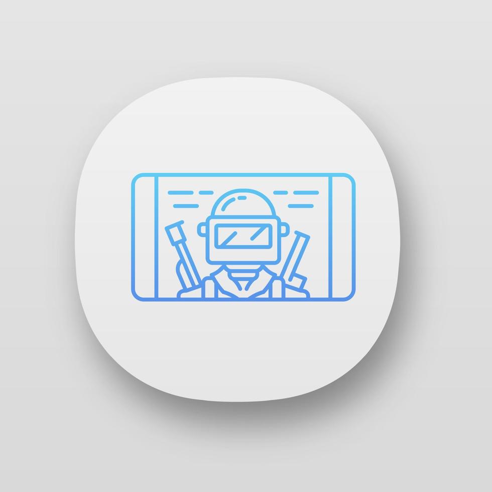 icono de la aplicación de juego móvil. juego de disparos para teléfonos inteligentes. pantalla telefónica con juego soldado, guerrero, jugador. ciberdeporte, esport. interfaz de usuario ui ux. aplicación web o móvil. ilustración vectorial aislada Vector Pro
