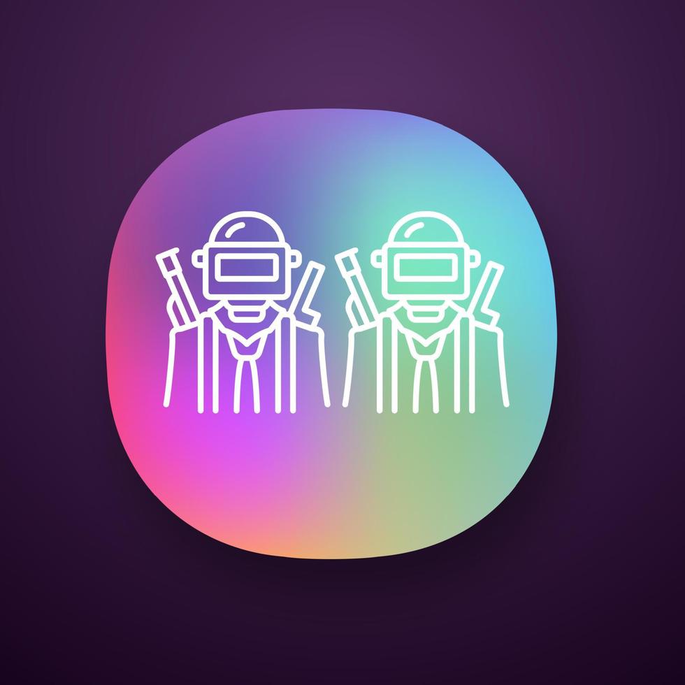 icono de la aplicación de soldados del juego. equipo de juego virtual. tirador de primera persona. multijugador en línea. guerreros, jugadores con armas. interfaz de usuario ui ux. aplicación web o móvil. ilustración vectorial aislada Vector Pro