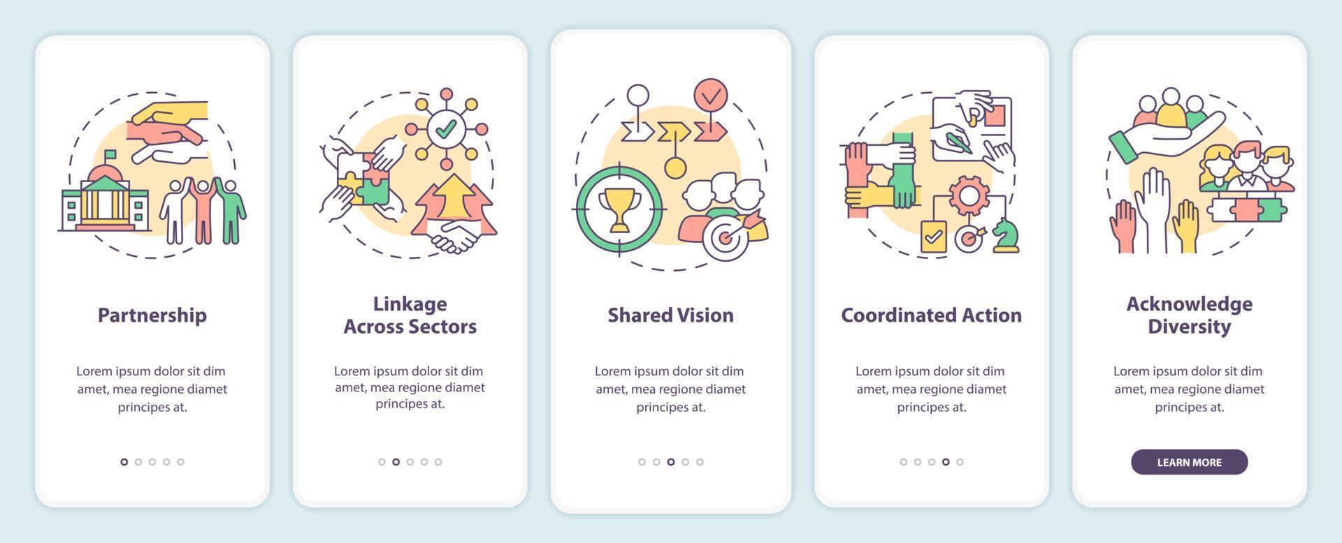 Principios de ilap incorporando la pantalla de la aplicación móvil. tutorial de planificación social páginas de instrucciones gráficas de 5 pasos con conceptos lineales. interfaz de usuario, ux, plantilla de interfaz gráfica de usuario. Vector Pro