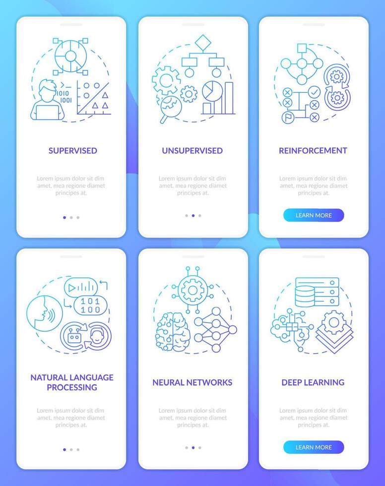conjunto de pantalla de aplicación móvil de incorporación de gradiente azul del sistema de inteligencia artificial. recorrido por páginas gráficas de 3 pasos con conceptos lineales. interfaz de usuario, ux, plantilla de interfaz gráfica de usuario. Vector Pro