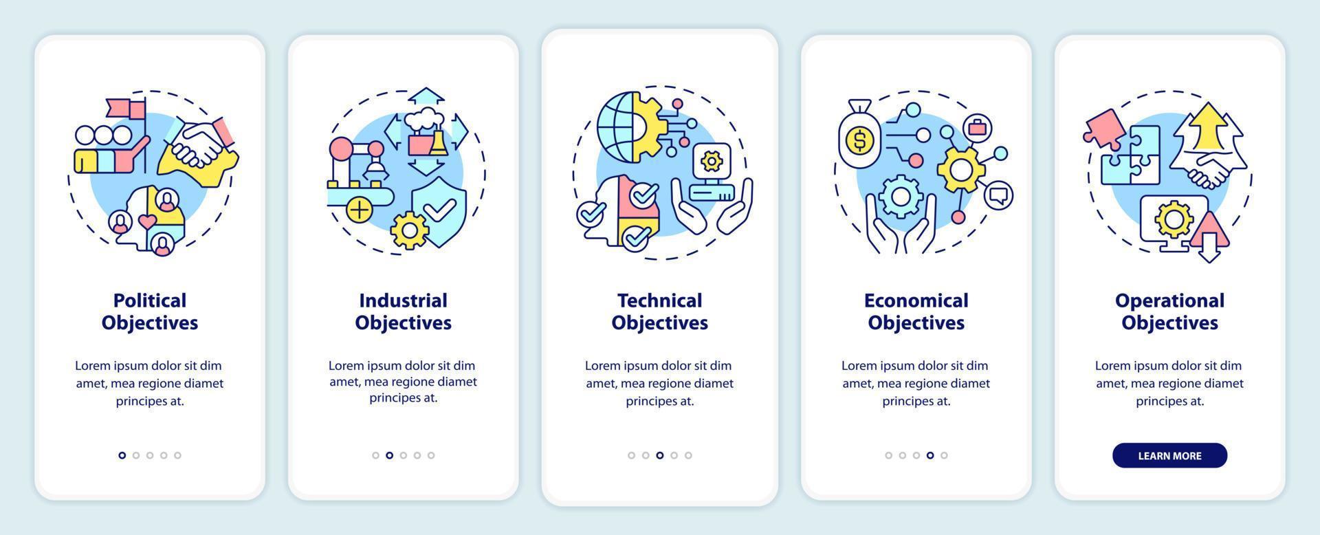objetivos de cooperación internacional incorporando la pantalla de la aplicación móvil. tutorial de objetivos páginas de instrucciones gráficas de 5 pasos con conceptos lineales. interfaz de usuario, ux, plantilla de interfaz gráfica de usuario. Vector Pro
