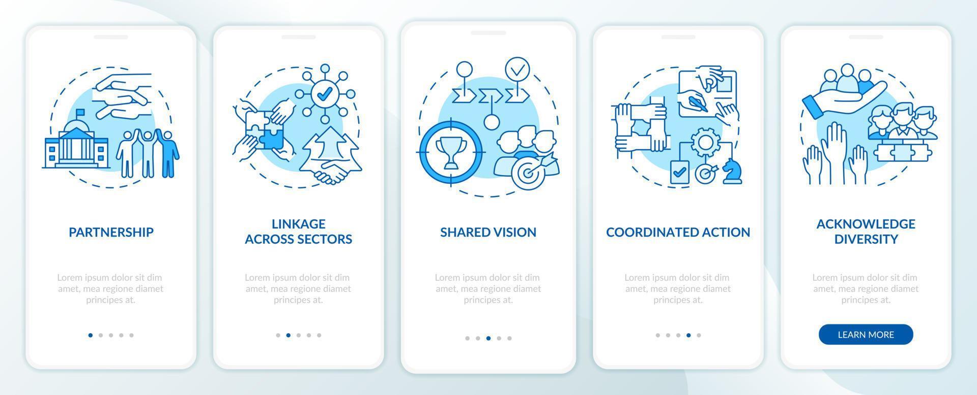 Pantalla azul de la aplicación móvil de incorporación de los principios de ilap. tutorial de planificación social páginas de instrucciones gráficas de 5 pasos con conceptos lineales. interfaz de usuario, ux, plantilla de interfaz gráfica de usuario. Vector Pro