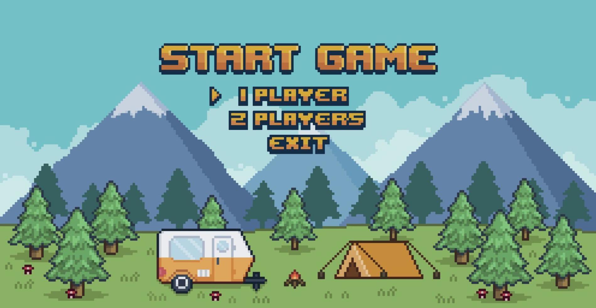 menú de juego de camping de pixel art. menú de selección de juegos con pinos, montañas, carpa y remolque de fondo vectorial de 8 bits Vector Pro