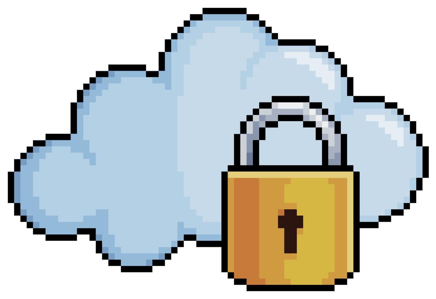 nube de pixel art y candado. icono de vector de protección de datos en la nube para juego de 8 bits sobre fondo blanco Vector Pro