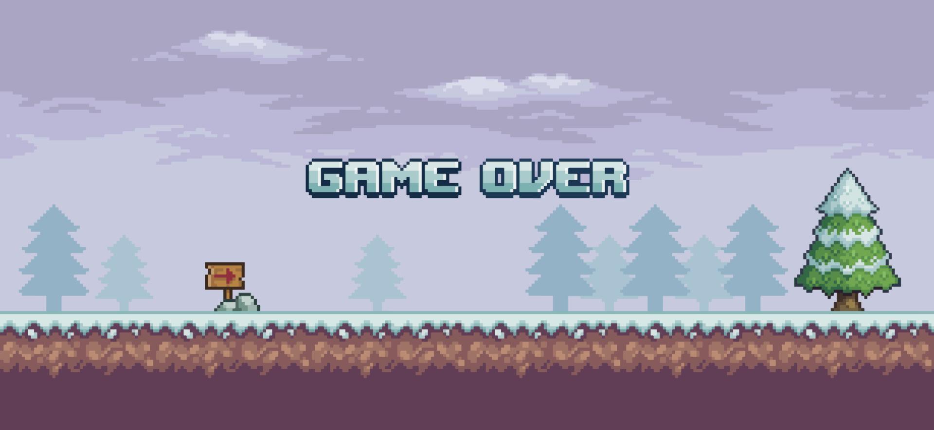 pixel art paisaje nieve juego de 8 bits. juego sobre fondo con hierba, árboles y nubes Vector Pro