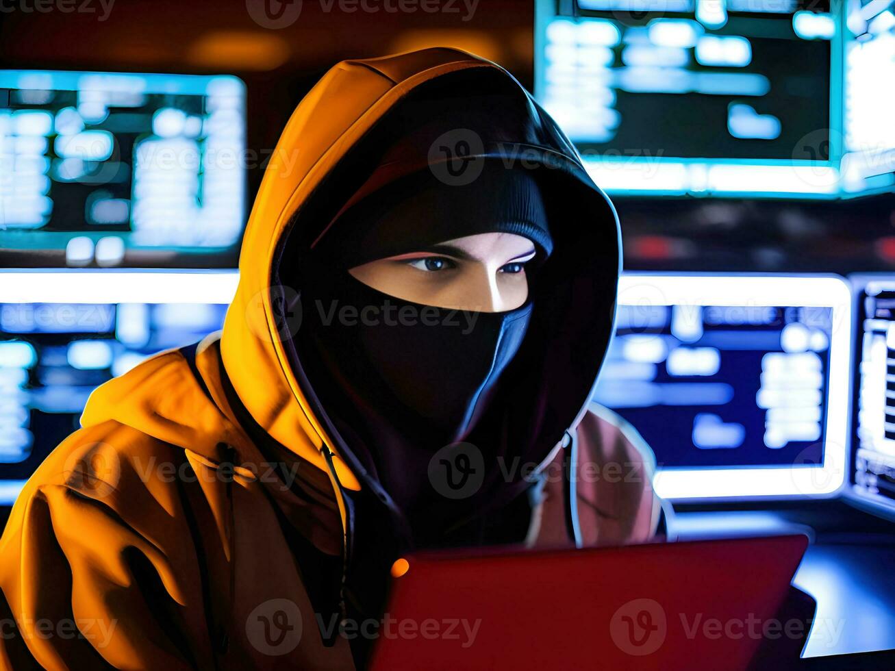 hacker en un capucha y máscara robando datos desde un computadora. ai generativo Foto Pro