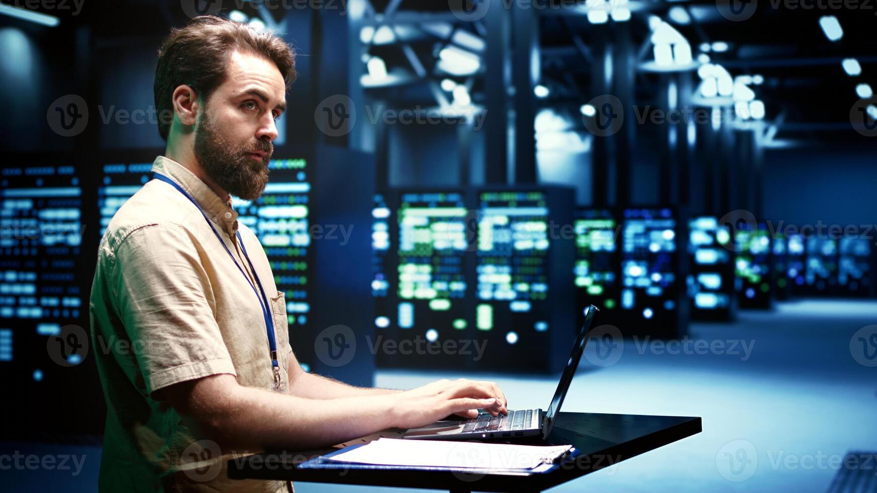 computadora científico corriendo servidor racimos diagnóstico pruebas y error comprobación utilidades a determinar y arreglar software problemas. mecánico investigando crítico sistemas, comprobación para fallas Foto Pro