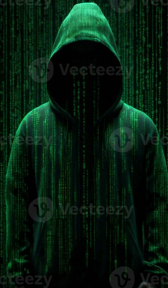 ai generado hacker en un capucha en el antecedentes de un computadora artificial inteligencia matriz Foto Pro