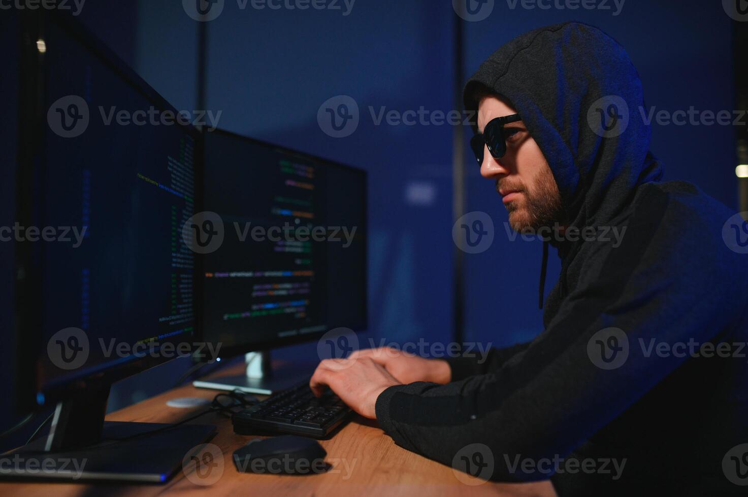 hacker sentado a escritorio en oscuro atmósfera. un computadora programador o hacker anónimo computadora hacker Foto Pro