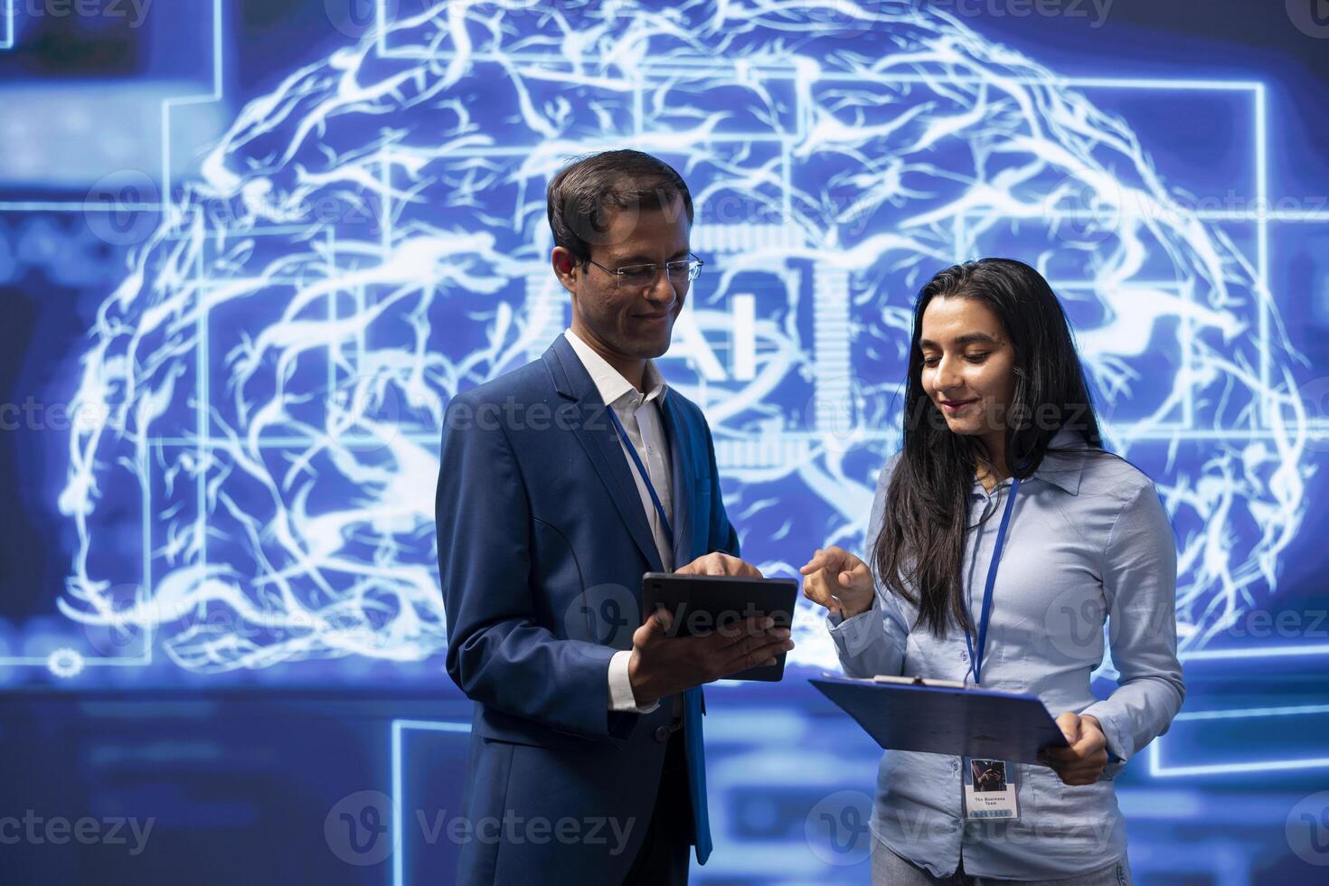 sistema administradores utilizar ai neural redes modelado después humano cerebro a resolver complejo problemas. puesta en marcha trabajadores utilizando artificial inteligencia a Mira a datos y completar Tareas Foto Pro