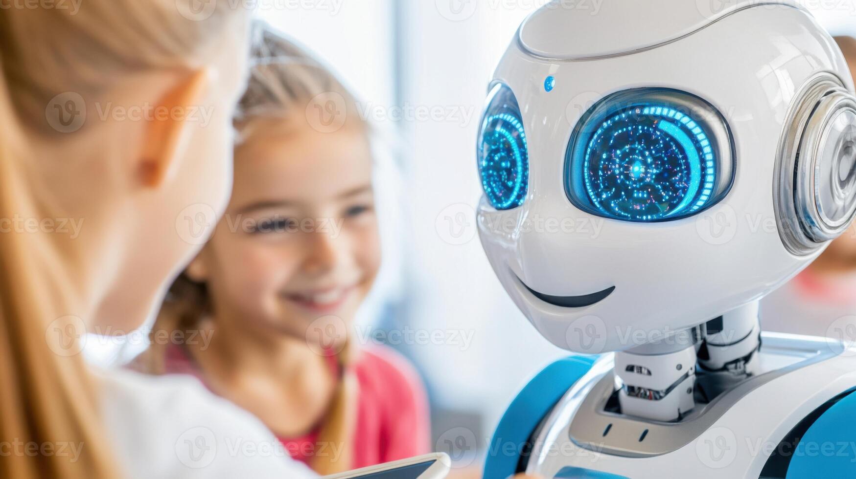 estudiantes colaborar con robot asistente a mejorar aprendizaje experiencia en un moderno salón de clases ajuste Foto Pro