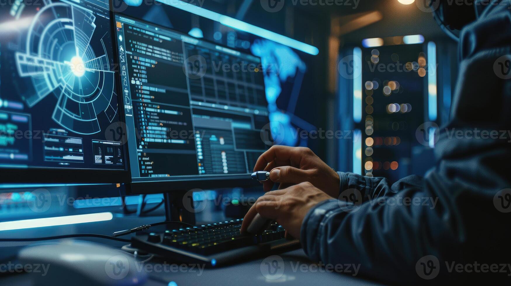 hacker trabajando tarde en múltiple computadora pantallas Foto Pro