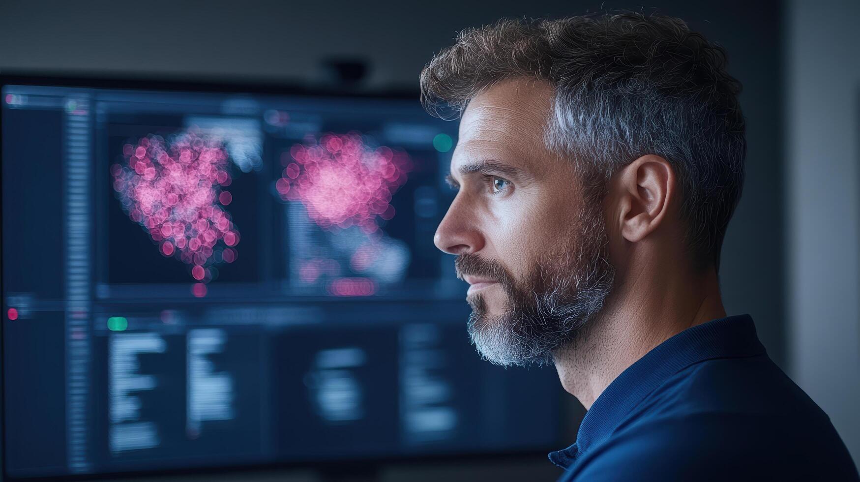 un hombre mirando a un computadora pantalla con datos en eso Foto Gratis
