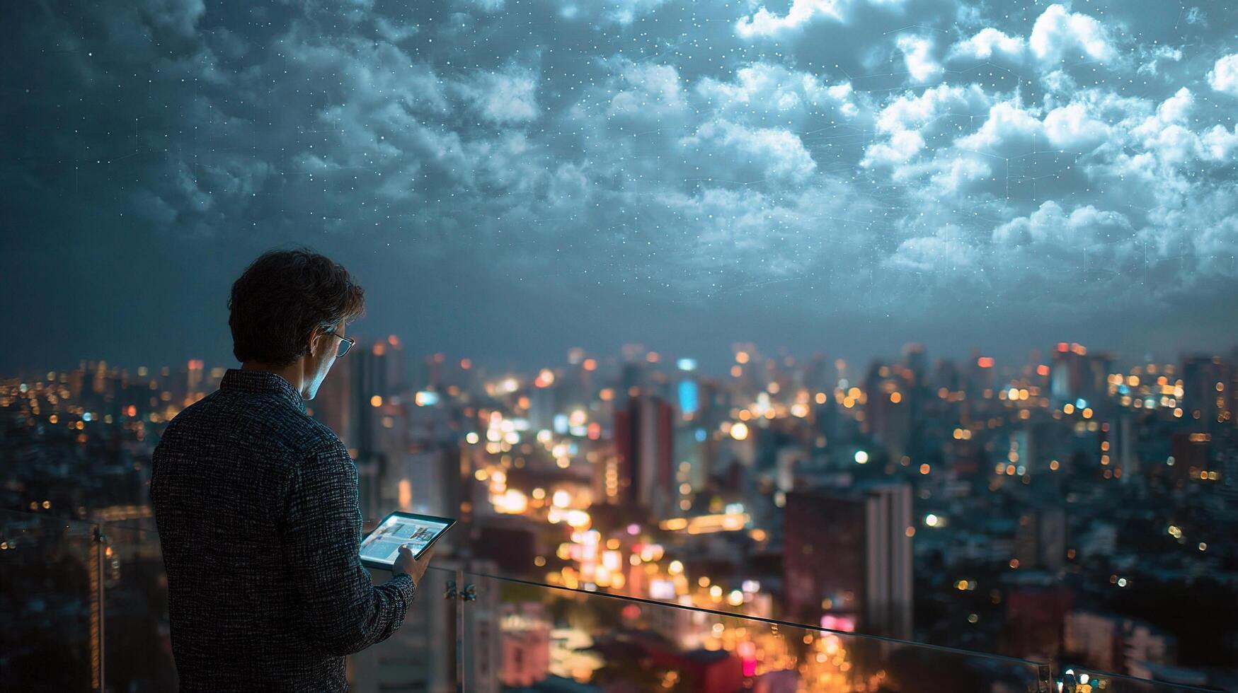 un hombre utilizando un tableta computadora en frente de un ciudad a noche foto