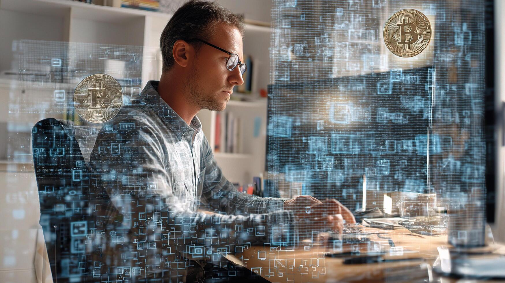 un hombre sentado a un escritorio con un bitcoin en su computadora foto