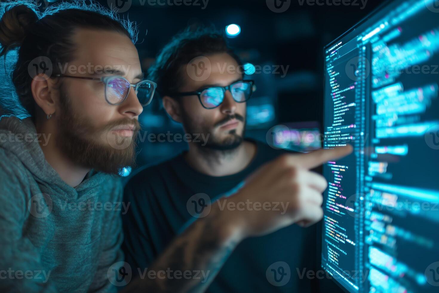dos programadores colaborando en software desarrollo mientras analizando código en un grande monitor en un oscuro habitación Foto Pro