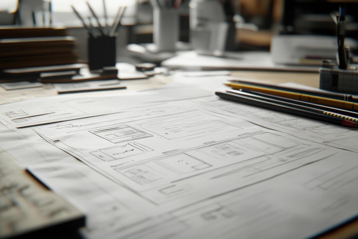 un escritorio con un computadora portátil, lápices, y un papel con un bosquejo foto